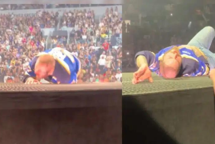 Los gestos y la actitud del también compositor hizo que no solo sus fans se preocuparan, sino que también el “staff” acudió a su auxilio inmediatamente al verlo tendido en el piso.
