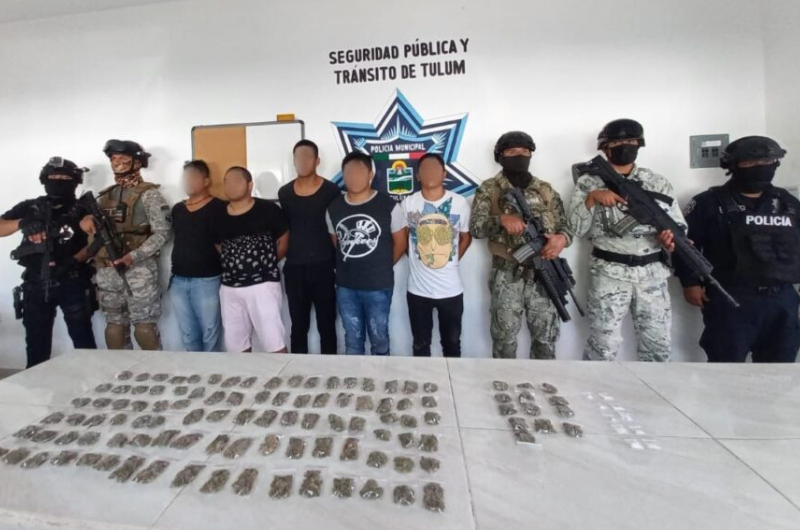 Detenidos quedaron José Manuel “P” de 18 años originario de Chetumal, Alberto “J” de 18 años originarios de Veracruz, Jesús “M” de 25 años originario de Chiapas, Eliazar “T” de 21 años originario de Veracruz, y Hernan “A” de 30 años originario del Estado de México. A estas personas les hallaron 115 bolsitas con marihuana y otras 10 de cocaína.