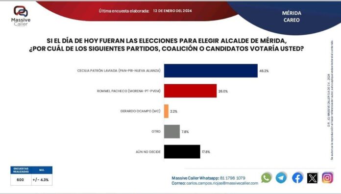 En el reciente estudio de Massive Caller, Cecilia Patrón Laviada lidera nuevamente las encuestas por más de 20 puntos de diferencia en la intención de voto para dirigir la alcaldía de Mérida.