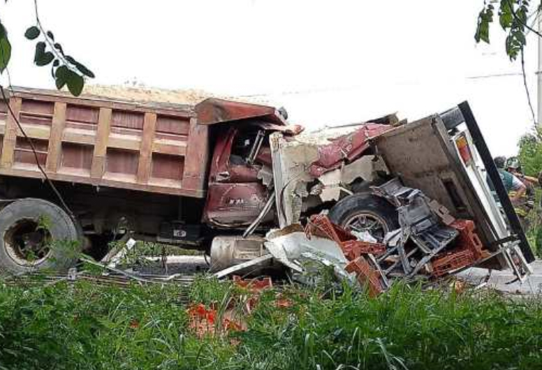 Un camión repartidor de la empresa Bimbo chocó esta tarde con un volquete en la carretera a Mérida, en su tramo Cancún-Leona Vicario, accidente en el que falleció el chofer de la primera unidad, al quedar prensado.